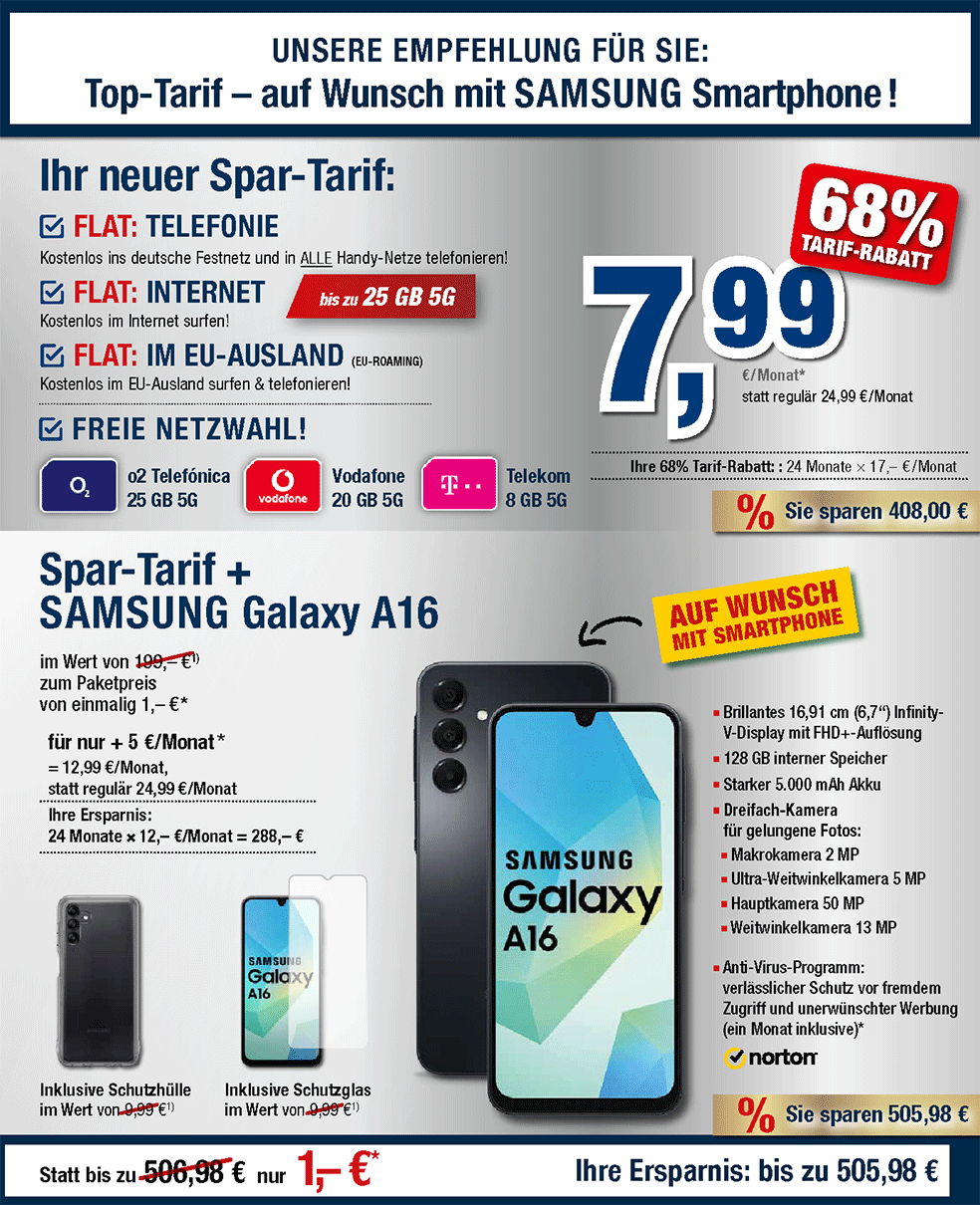 *Spar-Tarif-Infos: Die Aktion gilt solange Vorrat reicht in Verbindung mit einem Mobilfunk-Provider-Vertrag (Mindestlaufzeit 24 Monate, Startpaketpreis einmalig 40,90 €: 39,90 € Anschlusspreis + 1 € Paketpreis). Verfügbar in bester Qualität im Netz von o2 Telefónica (25 GB 5G), Vodafone (20 GB 5G) oder Telekom (8 GB 5G). Sie profitieren von 68% Tarif-Rabatt, der effektive Monatspreis beträgt somit nur 7,99 € statt regulär 24,99 € (bei o2 Telefónica und Vodafone) bzw. 21,99 € (bei Telekom). (Sie profitieren in den ersten 24 Monaten von 10 € Grundgebühr-Rabatt je Monat (bei o2 Telefónica und Vodafone) bzw. 7 € Grundgebühr-Rabatt je Monat (bei Telekom) auf der Rechnung und zahlen somit nur 14,99 €/Monat. Die weitere Rabattierung auf 7,99 €/Monat beträgt 168,00 € und wird Ihnen ca. 40 Tage nach Aktivierung ihres Vertrags als Einmalbetrag auf Ihr Bankkonto überwiesen). Im Monatspreis sind bereits Ihre SIM-Karte sowie auf Wunsch Ihr Handy inklusive Zubehör (+ 5 €/Monat) enthalten. Ihre Tarif-Vorteile: eine Telefonie-Flatrate für alle nationalen Standardgespräche ins Festnetz + Gespräche in alle Handynetze und zur Mailbox (ohne Service- u. Sonderrufnrn.) + eine SMS-Flat (bei o2 Telefónica und Vodafone) + eine Highspeed-Internet-Flatrate (25 GB 5G bei o2 Telefónica, 20 GB 5G bei Vodafone, 8 GB 5G bei Telekom) im Inland, danach surfen Sie unbegrenzt in Standard-Geschwindigkeit (GPRS) weiter. Sie telefonieren/surfen ohne zusätzlichen Aufpreis auch im EU-Ausland und nutzen die Telefonie-Flat sowie das Datenvolumen im Rahmen der Fair Use Policy. Norton Anti-Virus-Programm ein Monat inklusive, danach 1,99 €/Monat. Die Laufzeit entspricht Ihrem Mobilfunk-Vertrag inkl. kostenfreies Sonderkündigungsrecht im ersten Vertragsmonat. Der Versand ist für Sie gratis. Alle Preise inkl. MwSt. | Eine Aktion des handyservice der tema GmbH & Co. KG, Waltersweierweg 5, 77652 Offenburg
